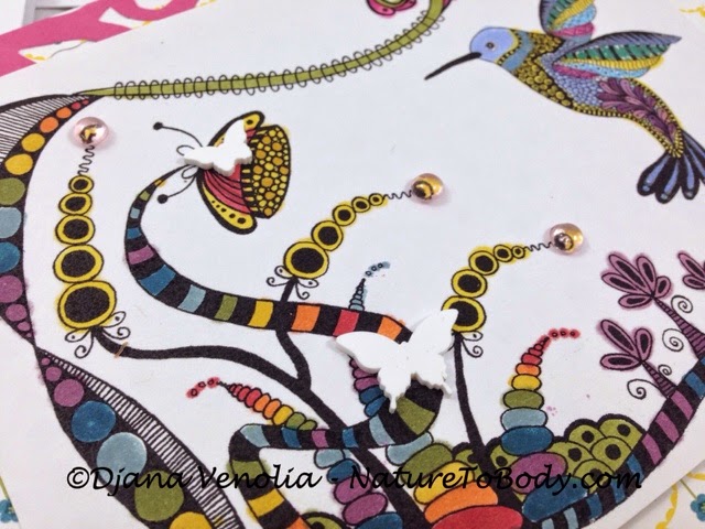 Eu tirei cópias de uma imagem de tangle, a variação do zentangle que tem um beija-flor lindo. Dai usando muitas cores, não só nas flores, mas em todo desenho eu montei meu cartao com uma base floral e finalizei com Dew Drops aqui e ali.